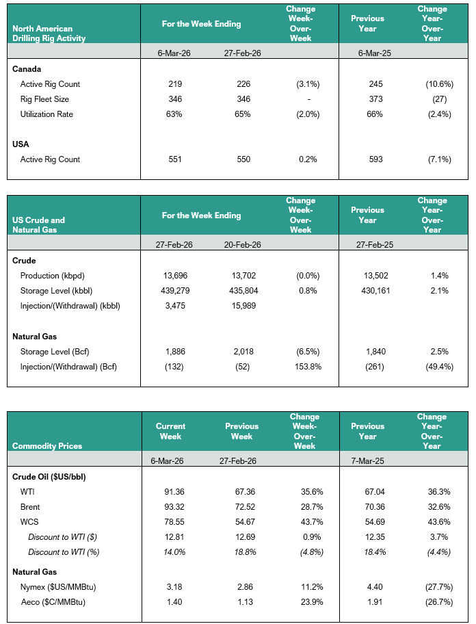 WTI and Brent prices exceeded US$100/bbl over the weekend as geopolitical tensions intensified in the Middle East. WCS was last trading above US$78/bbl, with the WTI-WCS discount shrinking from 19% to 14% week over week. With Middle Eastern crude supply halted through the Strait of Hormuz, global markets are turning to Canadian WCS for medium and heavy sour crude, increasing demand for WCS.